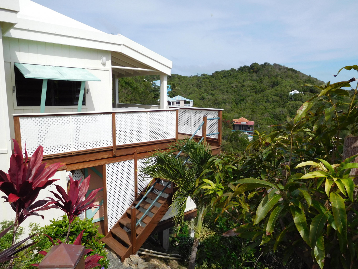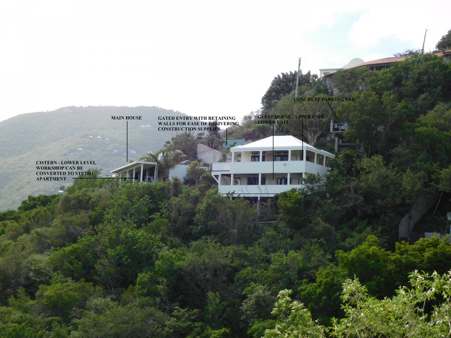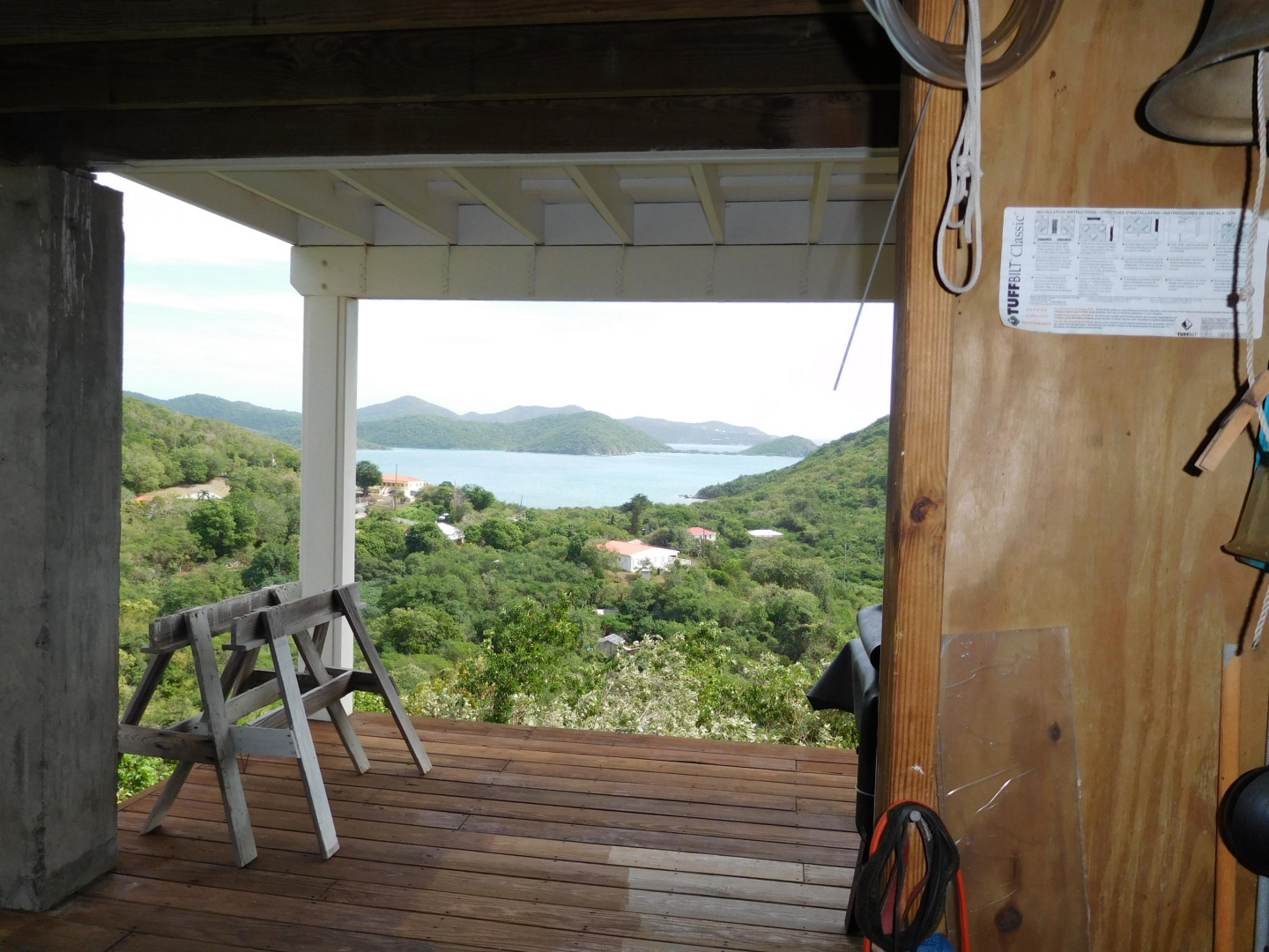 Exceptional craftsmanship with stunning water views! ''Coral Haven'' is a well-built (above & beyond code) frame guest house on a solid concrete foundation with two studio apartments situated on the main & lower levels located in the Seagrape Hill subdivision in Coral Bay with dual bay views over Hurricane Hole, Coral Bay harbor and beyond. Guest house completed in 2007 and main house started with 22,000 gallon concrete cistern in place with a workshop and expired plans for a 2 bed x 2 bath main house. Many options for new owner with much of the hard work completed! MUST SEE to fully appreciate the value, quality and Owner's pride int this exceptional property. Please see supplement for more information."Coral Haven" Guest House The guest house was completed in 2007 & issued a certificate of occupancy with a separate meter Hybrid construction with a 5,000 gallon concrete cistern foundation and frame construction similar to post & beam with 3x6 studs 24" on center with timber roof Roof is well built with 3x8 rafters; 3x10 hips; 3x12 ridge with 2 collar ties; Cyprus decking – purlins bolted – Rigid 1.5" insulation with ¾" plywood roof deck – elastomeric coating with water collection internalized Maxi-vue windows – most with redwood louvers Doors & windows all have full protection Caribbean style shutters Covered tile outside deck 30'x8' and 16'x6' Substantial 2 car concrete parking pad with gated stairway to guest house. Plenty of storage area below the parking pad and could be enclosed for dry storage. Garden shed has ample room for supplies, paint, etc. with a plastic 1,000 gallon water container for watering landscaping. The yard has lovely stone terracing and mature landscaping; a true gardener's delight with plenty of room to add your own personal touch! The guest house offers options for use. An owner can occupy upper and lower level; owner can occupy one apartment and long term or short term rent the other; long or short term rent both. Main house The main house has expired plans for a 2 bed x 2 bath house. Plans are available for review upon request. New owner can use existing plans or redesign. Current Owner was considering making main house 1 large bedroom x 1.5 bathrooms. Again, many options with this property for a new owner.